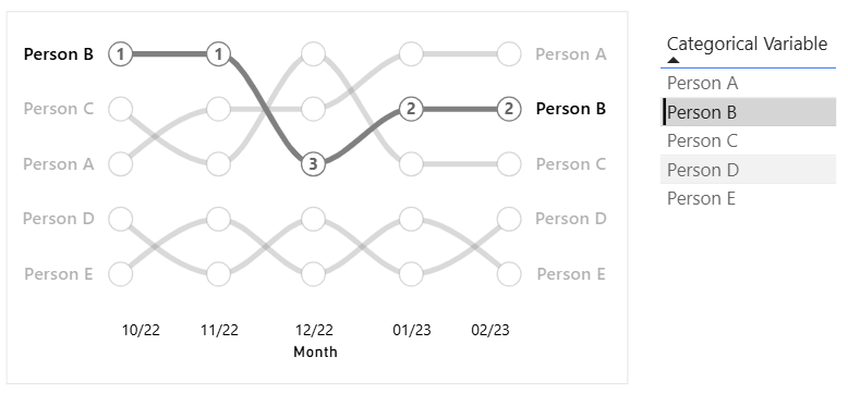 The intention of this visual is to compare ranks over time by categorical variable (“person” here). I used Deneb transformations to calculate the first and last months in order to add labels on either side of the chart as opposed to creating separate measures to identify these values. The selected table row shows how cross-highlighting can be configured within Deneb to achieve full interactivity within Power BI.