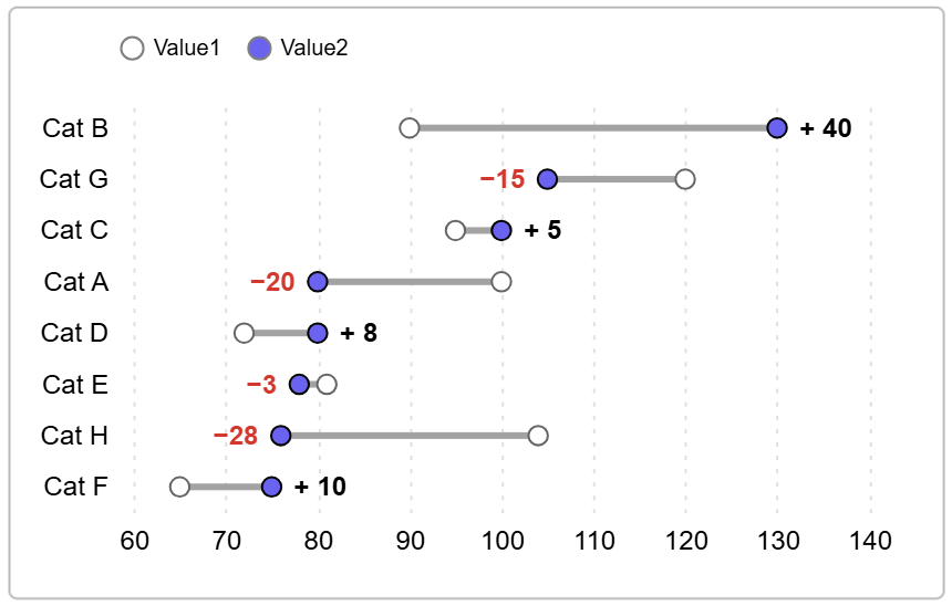 Comparing change from Value 1 to Value 2 which could be used to display differences between categorical variables or comparison of the same metric from one period to another.