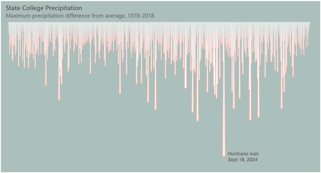 Had this been a professional project, I would have added x and y axes labeling the day number of the year moving from left to right and the max rainfall on each day number as the length of the drop. But I wanted simplicity so kept it sparce (I wasn’t planning to add any data labels until I saw the outlier on 9/18/04 — that data point I had to include!).