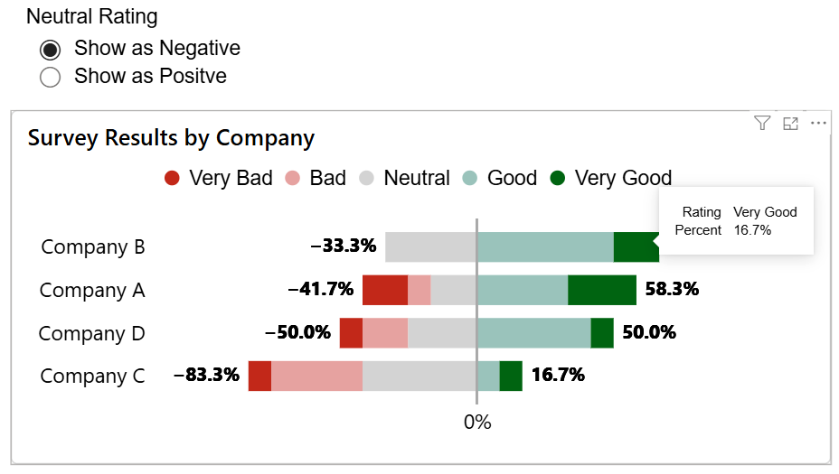 The simulates comparing survey responses across categorical variables. I played around heavily with transformations inside of Deneb to allow users to place a neutral rating on either side of “average”/zero. Tooltips are also configured within Deneb to prevent Deneb’s funky syntax, like “metric__highlight”, from automatically being displayed in tooltips.